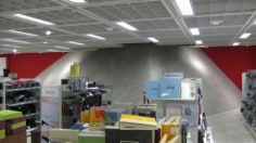 The second entrance, which seems to be the one that you used, enters from the children's section of the department store. There's no ticket control this way, so some of the people who go to the shop to buy stuff for their kids (not for kunst) may suddenly find themselves in the installation space. As far as my observation in the first week (I am back home [in Istanbul] at the moment), the shift—taken from either direction—creates some kind of alienation in terms of where you come from and where you go afterward.