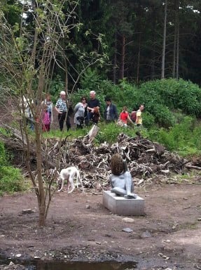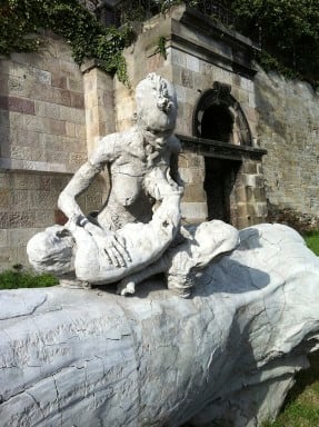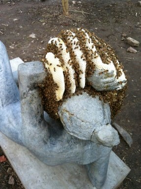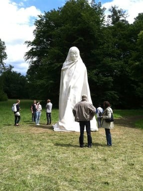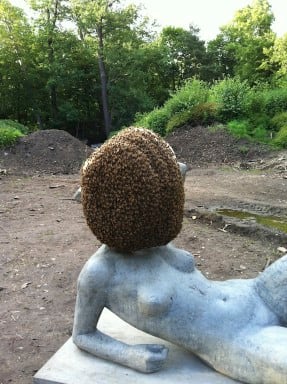 Sunken within a berm at the center of the yard—full of compost debris and puddles reflecting Kassel’s perpetually cloudy skies—reclined a nude on a bench cast in cement. A bulbous beehive coiffure of honeycomb cornrows engulfs the statue’s head. It is the stuff of Surrealism in which the generic and the ordinary become uncanny; the eyes of beauty have been replaced by an insectarium. The microcosm of femininity is trapped at once in the classical signature of the sculpted female and it is encased in the intractable industry of tiny, prehistoric creatures that the artist has installed on its head.