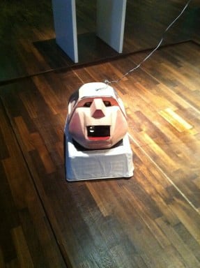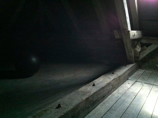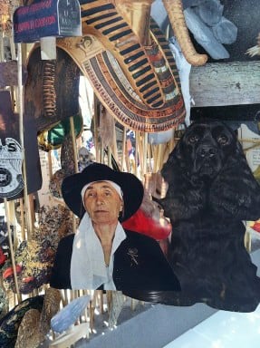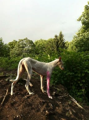 The work presents a small forgotten Eden in an unkempt state that stars a brown female puppy named Señor and a white bitch with a pink painted paw named Human. Their master and the artwork’s groundskeeper, fed the dogs. Señor hungrily munched on a bloody bone on one of my visits and Human drank stagnant water from a mossy trough. The older dog, like his laconic keeper was skinny and seemed to be put together with birch tree branches. Their names, Human and Señor, indicated that these live characters were like the other set pieces, analogies or entities of the microcosmic sort Spengler describes above: distinct samples of the larger totality of which they are a part—just as the artwork is one of many in the exhibition and the viewer is just another viewer.