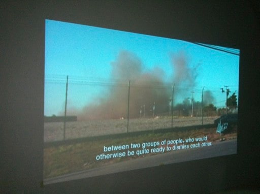 The same images seen on the walls in the main gallery, hung as video-stills are analyzed in the lecture. Each freeze-frame shows the inaccessible drama Mroué tries in vain to expose in the lecture. Naked violence, we are made to understand, escapes comprehension along with the life that leaves the victim. Excessive force has not been captured on film, despite appearances; it has been relegated to the oblivion of the archive which swallows citizens’ identities in the same summary way it gave it.