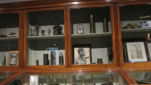 To the right, the second vitrine holds two tools emblematic of their era: a stone-age blade made of rock and a rifle bullet from World War II corroded by battery acid.