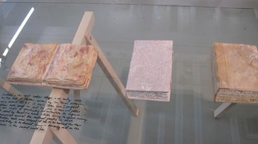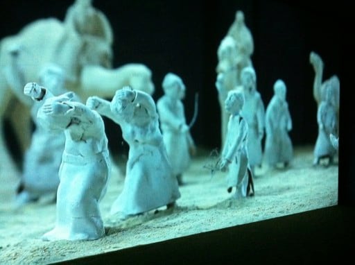 For his Documenta 13 installation in the Hauptbahnhof, Mroué looks at the current civil war in Syria through disturbing videos of people being shot and killed in the first person he has evidently found on the internet. The YouTube videos of assassins as seen by their victims made with cell phone cameras and handheld devices are confused and noisy documents. To add to the discord and distance of the macerated videos, the artist has made clever little flip books that show the assault frame-by-frame as the soundtrack plays with the push of a button. Each flip book rests on an ink pad that stains the user’s fingers with blue ink. The temporarily mark personalizes the media images that came out of Iraq and elsewhere when voters were forced to dye their fingers in order to participate in an election.