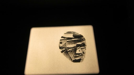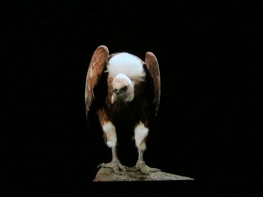 Despite being quite captivating, nothing in fact occurs—except for the intensity of the musician's face contrasting the expressionless face of the scavenger. Even with the shrill sounds of the flute, the bird-image imposes silence into the suspended space of prehistoric music. The animal stillness that suggests the bird is listening with its Old World vulture ears to the flute's bird-like sounds absorb the viewer in the act of listening to the minimal shrieks. At one point the peculiar creature seems to sleep or meditate on the noises, groveling its head downward before it stirs once again in response to a penetrating note.