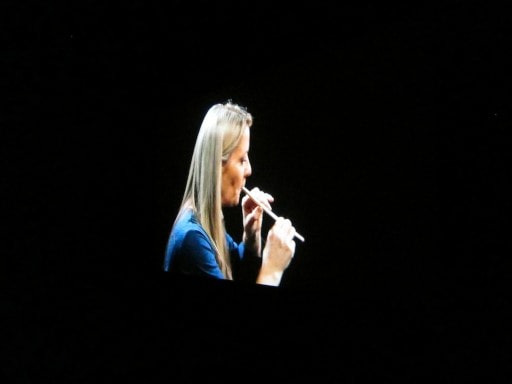 The effect of the interaction is unusual: strident tones escape from the flute yet the visual impression is utterly soothing as the high-definition lighting shows the calm disposition of both actors. It is easy to be drawn into this uncanny interaction and the discordant yet tuneful drift through time. It was both theatrical and absorbing.