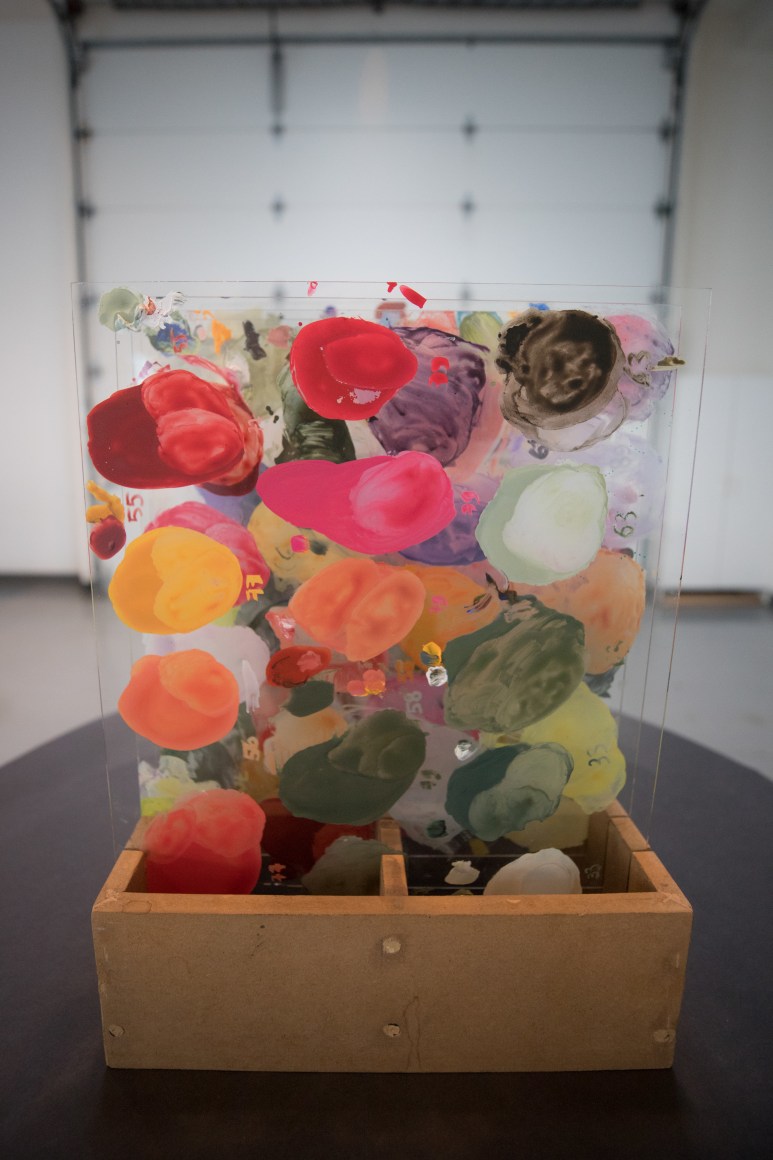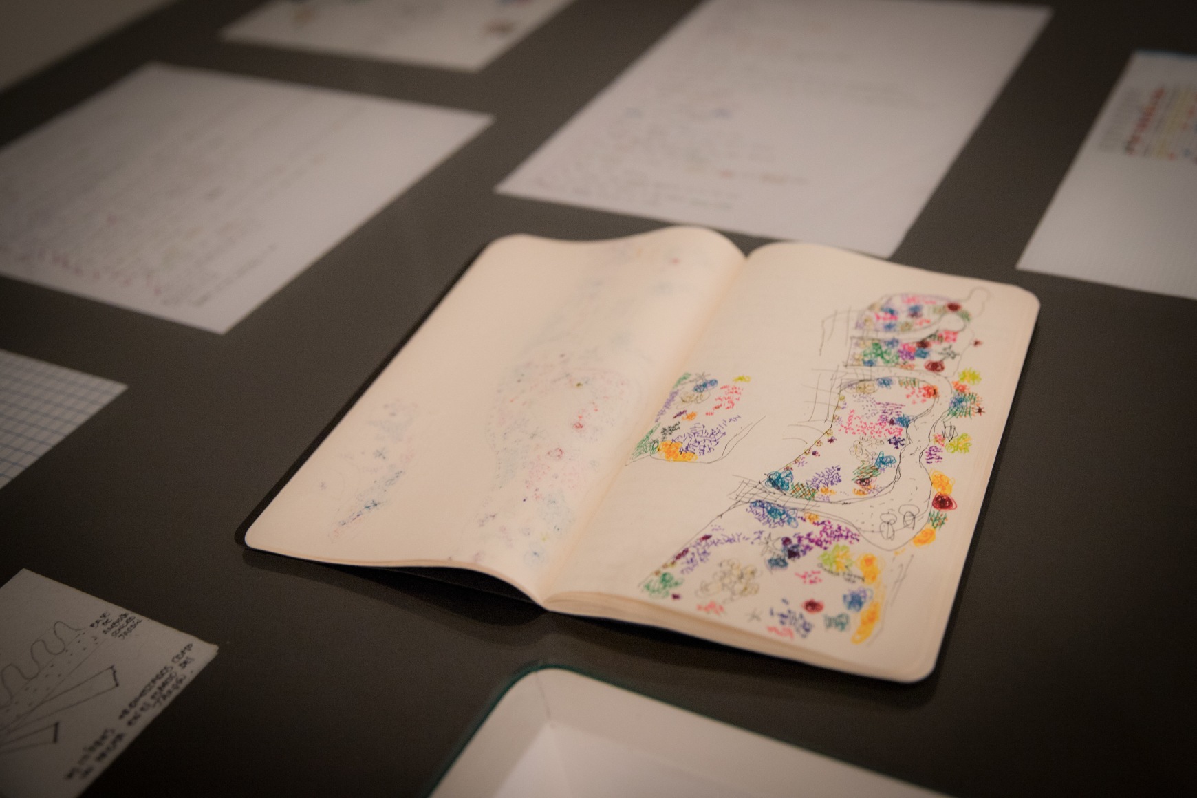 The collaboration between Meyenberg, Shea, and the garden followed a complex process of translations from which emerged a chromatic language. One hundred pages of a journal became a chromatic score made of 45 drawings that capture the rhythm of the garden through its colours. This apparently geometric and abstract exercise has another side to it. Meyenberg challenged himself to match Shea´s ability to recognize the singularity of the colour of each flower of the garden producing an exact corresponding colour in gouache and then freely incorporated silences to produce its own interpretation of the garden´s life flow.  This chromatic language is further explored in the video in which Meyenberg follows Shea through a tour of the garden described solely by its colours. Meyenberg´s visual and audio edition produces a chromatic poem that unveils the deeply intimate and epidermic nature of this language. In Shea´s own words: one cannot see if one does not touch. But again this is not an abstract language, each flower dictates how it should be touched and Meyenberg offered Shea the aesthetic tools to let us in this deeply intimate, almost erotic dialogue.