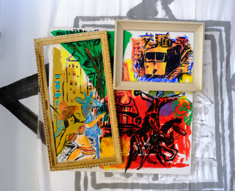 Their interest in the subject matter struck me as the solution to the artistic problem that I had: simply stick postcards on the abstract paintings. Which I did using broom straw to “sew” them to the paper since glue was hard to find. These “Postcard Paintings,” or this layering, of content and abstract background began to move from two dimensional works to three dimensional living spaces.