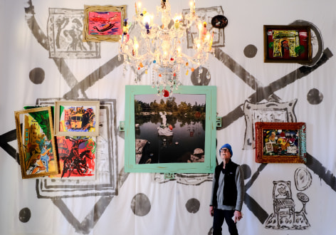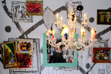 Frames, framing, or isolating different parts of a larger painting; postcards overlaying an abstract painted background; the ghost images being overlayed by a painting or a plate; the chandelier with its Venitian inspired glass figures overlaying all that is on the walls, including the ceiling .