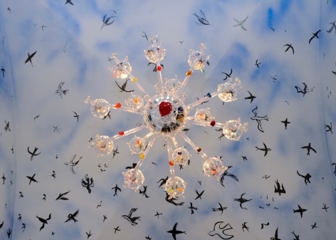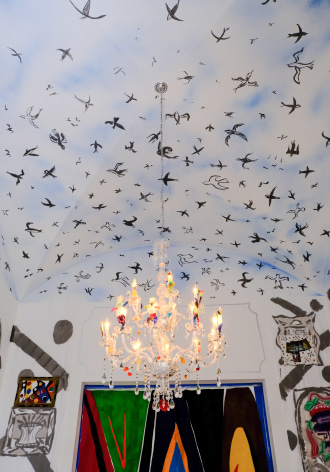 The title “Flight of Fancy,“ as this dining room installation is named, derives certainly from the Swallows, and from the photograph of two boys dressed with shiny ribbons for a Indian holiday commemorating siblings, brings to mind a “Salon” in which it is a dining room, but also a stage of sorts, where the guests are just that, guests at dinner, but also actors and audience as well. The unfamiliarity of the surroundings seem some how familiar, like something from a dream, and the images, both paintings and photographs, the Swallows flitting about in the rendered sky overhead, and the small glass Venetian figures on the re-made chandelier create a mysterious but soothing dramatic environment that allows all to party on in good spirit.