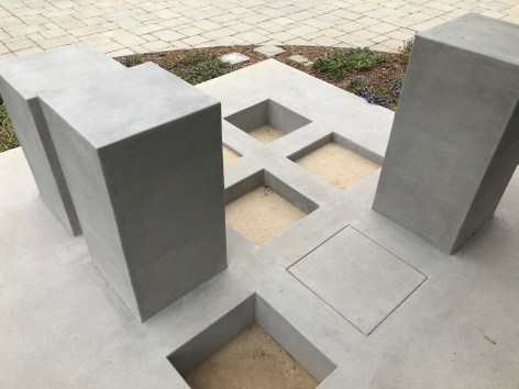 Monumental Negative-A Family Portrait invokes geometry, through the affective elements valued by Plato. For this it started from a numerical arbitrariness, determined by the members of the Haudenschild family and their heights. Measures were taken and raised depressions or elevations in the soil were excavated or constructed so that all the relatives could be of the same stature. By a happy coincidence, the matriarch of the family is the only one to be at ground level. The members were arranged in alphabetical order as a means of blending the generations—a monument to the dissolution of the hierarchies, the presences, absences, and the natural misalignment that time provides.