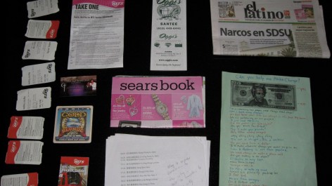 On May 10, the packages were opened and the day of service was discussed, moderated by Jeff Kelley, critic and author. The discussion took place at the haudenschildGarage consecutively on three continents via Skype. The participants divided themselves into three groups to further interpret Travelog in San Diego. Curators, Lucia Sanroman & Stephen Hepworth together with Diane Rothenberg, social anthropologist and author, and Jerome Rothenberg, poet and professor, led the groups. Group participants included Belinda Bijun Sun, George Bolster, Giacomo Castagnola Chaparro, Rishi Chadha, Coryl Crane-Kaprow, Mary Evangelista, Steve Fagin, Eloisa Haudenschild, Ariana Hernandez-Reguant, Monica Jovanovich, Laura Kwak, David Matlin, Sean Neil, Kyong Park, Alan Rosenblum, Gail Schneider, Carlos Trilnick, Christin Turner, Nina Waisman, and Sybil Wendler.