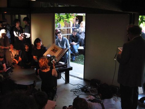 The event’s third act, “Book Private Viewing,” took place in an even smaller adjacent space, where we could examine the curious volumes up close, with Jovanovich carefully opening up with pages to reveal the concealed mechanics of the moving imagery, this concluding gesture suggesting the moment within liturgical gatherings (Jewish and Christian, at any rate, certainly) after the book has been “performed,” its text having been exercised as the book resumes its status as uniquely spectacular (secular? divine?) fetish object. As one of modernism’s touchstone dwellings, the Schindler House was the most congenial space imaginable to witness The Last Book’s descent, a structure aspiring to transcendence through the material and the proportions of the mundane.