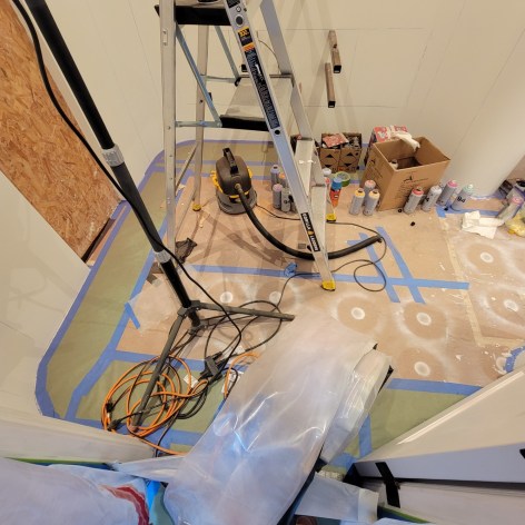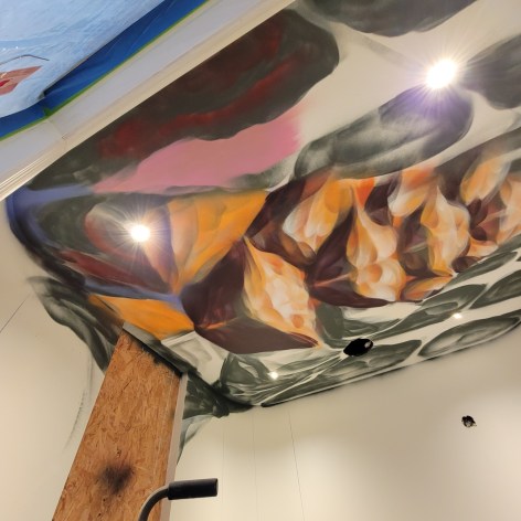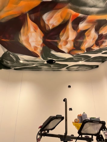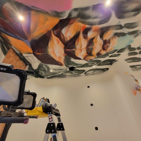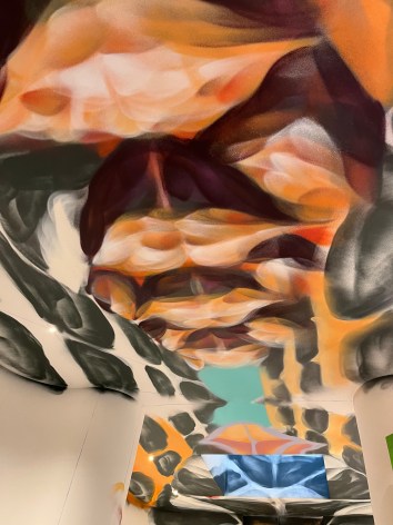My movements and perception of the room influenced fluid gestures that flash between abstraction and emerging familiarity. They seemed to seep totems as they emerged from the haze through the thin application of aerosol and HVLP spray gun application. Grounded in fragments of my own personal histories, moments of tangible artifacts and memory interweave with movement and abstraction. Like fluid apparitions, the integrated forms materialize incompletely. These forms were based on different states of being, of struggle and triumph, despair, and resolve.
