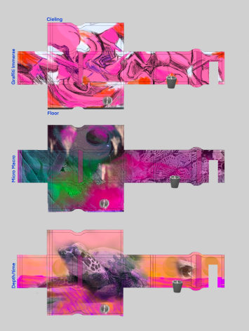 Calm eyes, clenched fists, sagging figures, sporadic movement, and an ominous jaw are followed by rising plant leaves as one approaches the door. Influenced by closed-eye hallucinations, the immersive hues reference internal vision, while sound connects us to the outside, fleeting world.