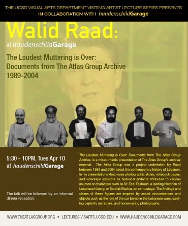 On April 10, 2007, the haudenschildGarage collaborated with the Visual Arts Department of UCSD to present a Garage Talk with Walid Raad on his project The Atlas Group.
