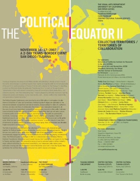 On November 16, 2007 the haudenschildGarage collaborated with the Visual Arts Department of UCSD, inSite, CECUT and Casa Familiar to present the Political Equator II Conferences: Collective Territories/Territories of Collaboration.