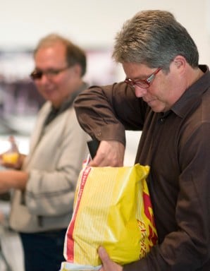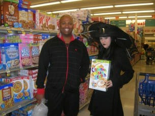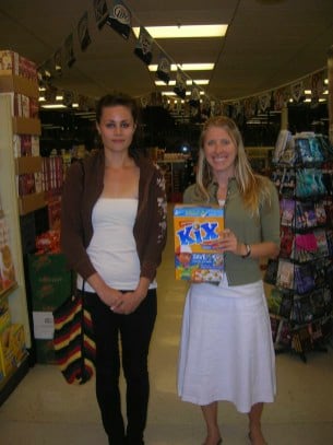 Two female graduate students, one distinctly goth (Kadimah Elson), and one distinctly not (Britta Larson), took turns, in the cereal aisle of local markets, asking patrons which cereal they would recommend as appropriate for her, and then, if the patron was willing, was photographed with the cereal and its recommender, and, regardless, purchased the cereal.