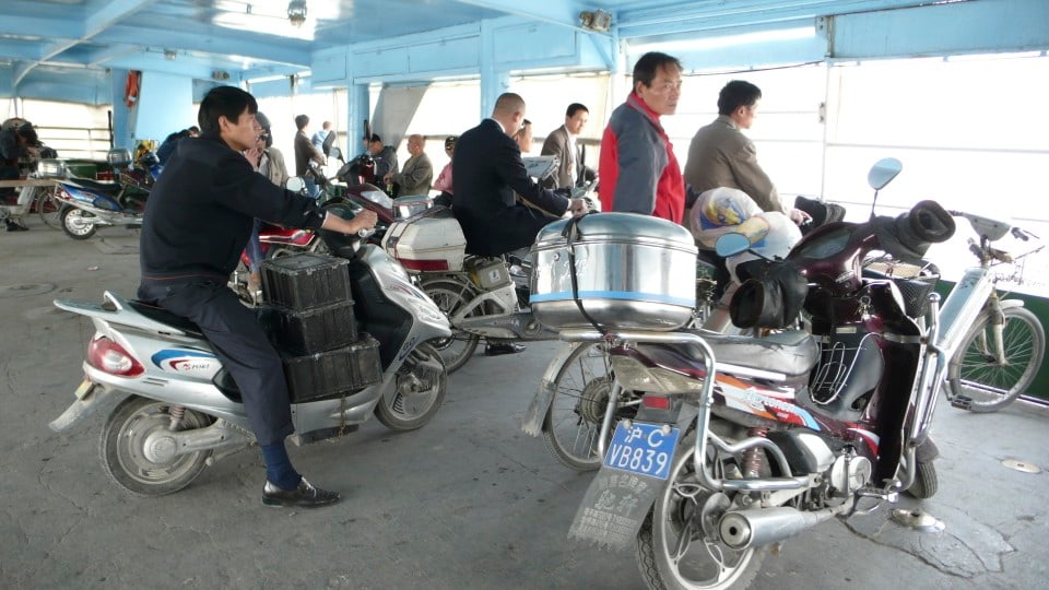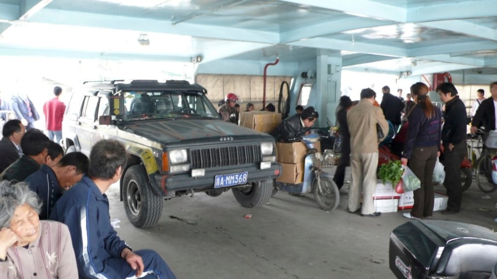 After a light sleep the night before, I got up at 7am and took a shower, and arrived at Lin Yu's at 8:10am to drive north. Traffic was quite good on a Sunday morning. After Central Cycle, we missed the Yi Xian Lu Elevated Line, and had to drive on the ground road among the container trucks. At 9:19am we found our first ferry-station: Wu Song Lu Ferry, where our jeep could ferry across the river. I lived by the river when I was young — at that time there was no bridge but a tunnel, cars crossed the river mainly by means of ferry. Now this ferry line is the only vehicle ferry. But we were shocked when a passenger ferryboat reached the wharf; a staff told us to drive our jeep directly into it! The vehicle ferryboat in my memory has totally disappeared...