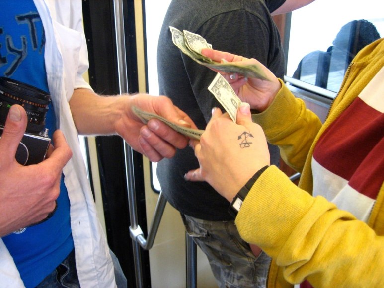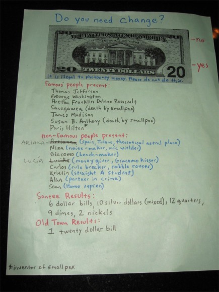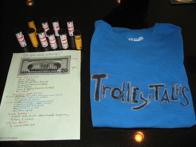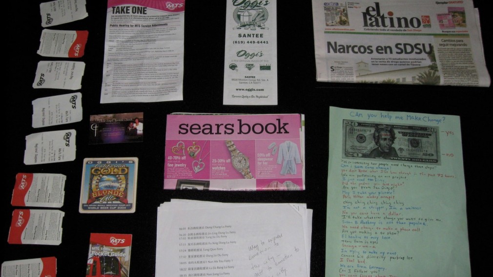 Lucia Sanroman's group worked off of FERRYTALE and looked to the trolley lines in San Diego for their project titled, TROLLEYTALES. They engaged those taking the trolley through asking for change (a comment on the need for exact change for the ticket machines at trolley stations). Trolleytale was a project inspired by Song Tao and Lin Yu's FERRYTALE in Shanghai. Lucia's group (Giacomo Castagnola Chaparro, Ariana Hernandez-Reguant, Sean Neil, Alan Rosenblum, Carlos Trilnick, Nina Waisman, Christin Turner) decided to travel on San Diego's trolley lines, interviewing the passengers. Additionally, they engaged people through asking for change for a $20 bill as none of the stations have change machines and the ticket machines only take exact change.
