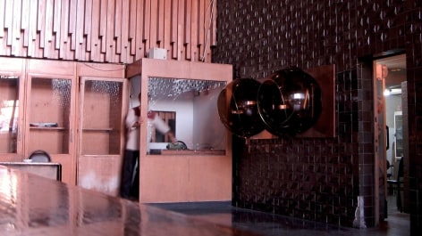 In both cases, the work of Armenian artist Vahram Aghasyan and Japanese artist Tomoko Yoneda explore comparable themes of failed ‘modernities’, and, in particular, the urban residues left in post-soviet countries. These fail to resonate in the AKM due to how the interior intensifies the medium’s two-dimensionality. In this sense, some projects presenting serious and compelling issues are only supplemental to the curatorial thematics envisioned for the space. But this points to what I find most alluring about the exhibition: it confronts the impossibility of curating the AKM. One can feel a tension as the building stubbornly refuses to recede into the background and the retrograde interiors come back to life.
