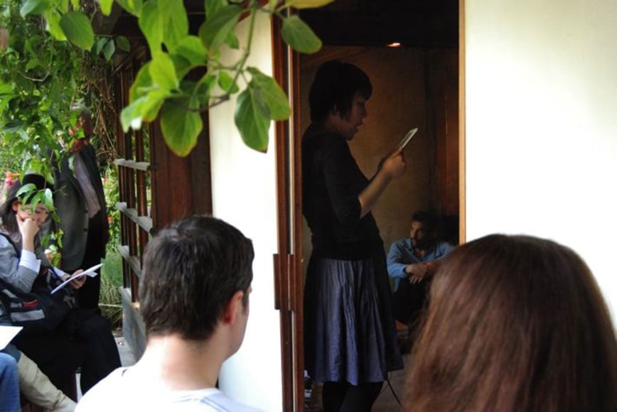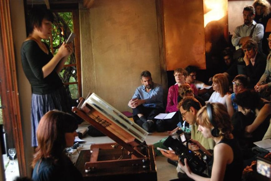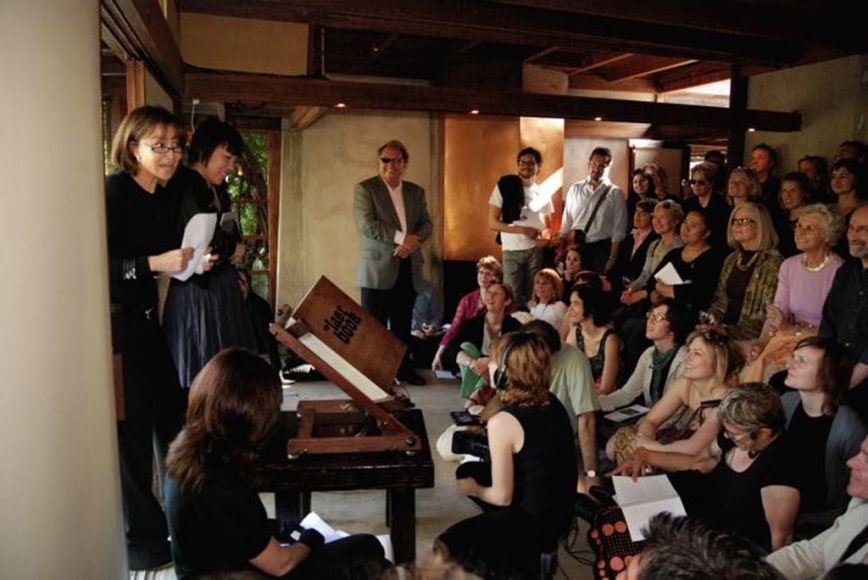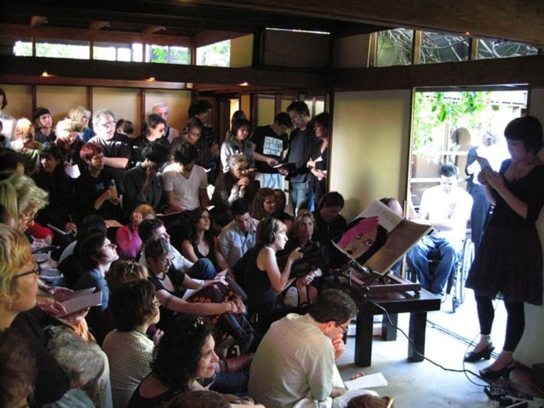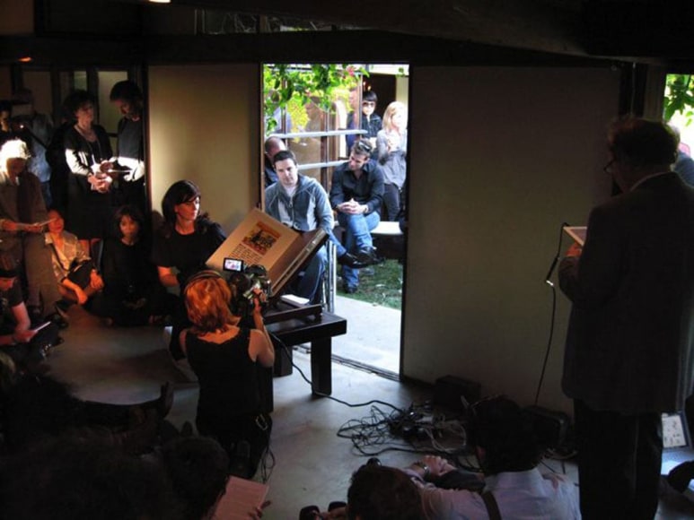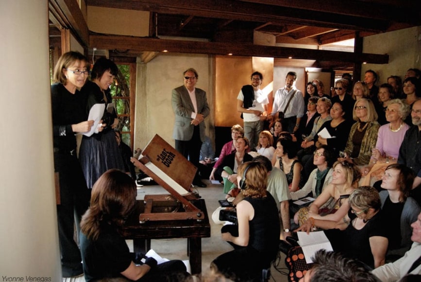 Reading aloud to a group of people is an intimate act, which is why readings are among my favorite activities at the Schindler House. The landmark modernist House and Studio (R.M. Schindler, 1921-22) was designed for precisely such kinds of events, and has hosted many avant-garde performances over the decades. The Schindler House embodies architecture as both idea and living organism. For the Last Book reading, a rowdy tale and the human voice activated the space as intimate, artistic, and social.
