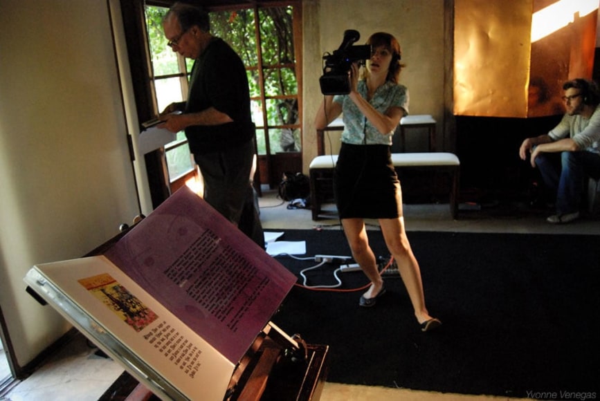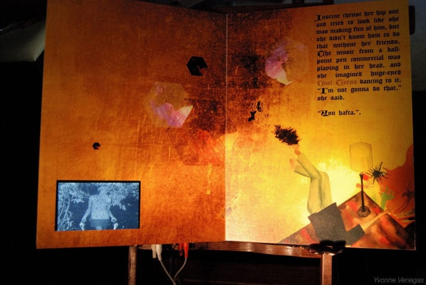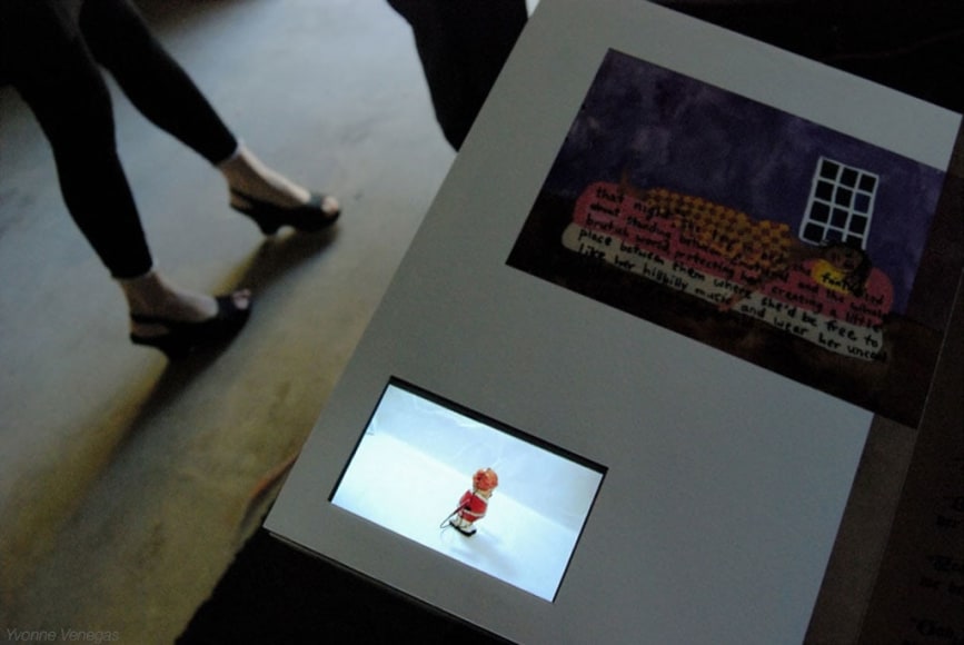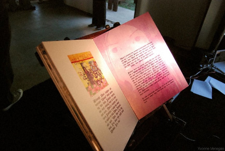 Last Book participants include Eloisa Haudenschild (producer and line producer), Monica Jovanovich (stage manager), John DeMerritt (book binding), Joel Swanson (graphic design), Tad Linfesty (easel and book fabrication), Jim Nisbet (book fabrication), William Brent and Marco Llanos (electronics/technical coordination), Hsiufang Chen and Kate Wall (printing), Alastair Johnston, Teddy Cruz, and Alan Rosenblum (consultants), and Patricia Montoya (video assistant). The Last Book performance photography by Yvonne Venegas and video documentation by Merve Kayan.