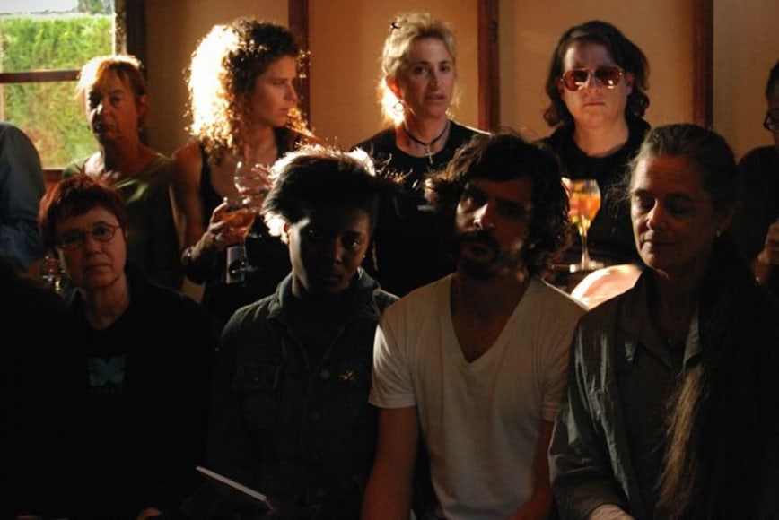 Mainly drawn from various art and academic scenes in Los Angeles and San Diego, the hundred or so attendees (including former Wexner curator Melodie Calvert and such former Wexner visiting artists as Adrienne Jenik, Rita Gonzalez, and Jordan Crandall) socialized outside during the first act, where it became clear that most of us had only the vaguest idea of what we were in for, other than being told that at five o’clock we were to gather inside, in the alarmingly small main room opening onto the lawn. Consulting the programs we were handed upon entry, we learned that the performance itself was in three parts, each featuring a different excerpt from Mary Gaitskill’s Two Girls Fat and Thin, who’d given her consent for her texts to be part of the performance. Once inside, literally shoulder to shoulder, the audience was greeted by Fagin, in compère mode (think the Peter Ustinov character in Ophuls’s 1955 Lola Montes), explaining the order of the evening, centered on the readings of three separate books