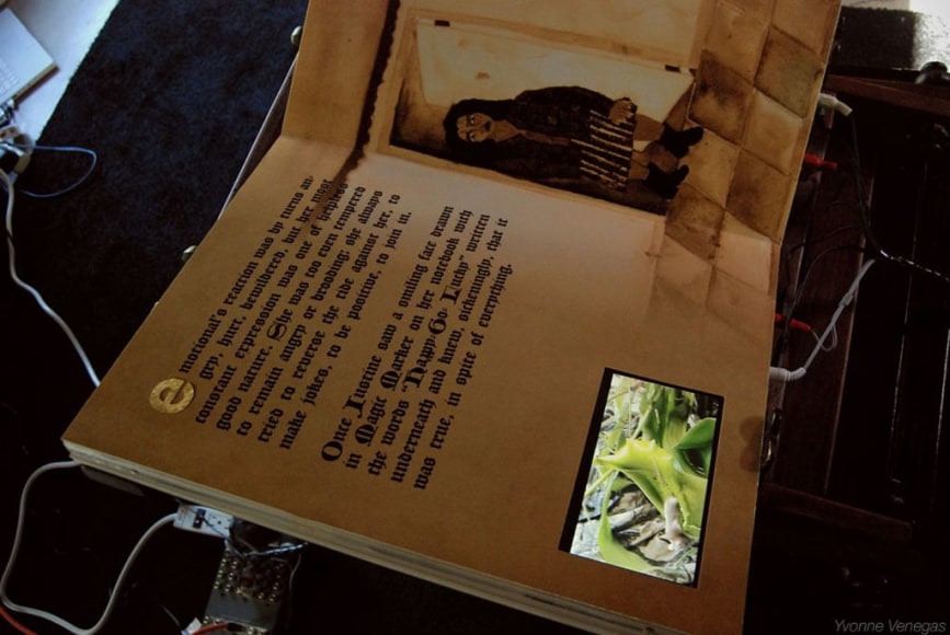 For this project, the haudenschildGarage, Spare Parts produced an homage to “the book” in the age of the conquest of the Kindle. Steve Fagin wished to resuscitate the magnificence of the illuminated manuscript as the world turned toward darkness. Perhaps electronic technology could be used, not to leave the book on the dustbin of history, but to reconstitute a forgotten past where words and images danced in each other’s arms.