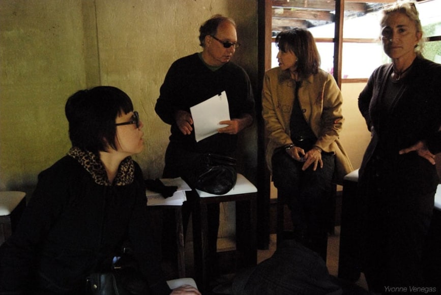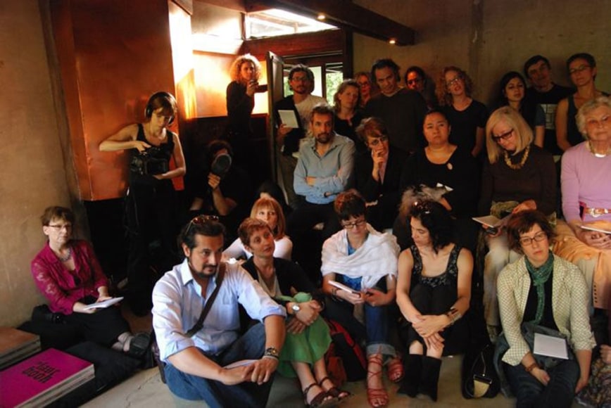 Officially, the event was a production of the haudenschildGarage, a shape-shifting entity formed in 2003 by the prescient and engaged impresario Eloisa Haudenschild, the president of inSite (which commissions and presents cultural interventions within the border region of San Diego and Tijuana) and a catalytic collector and supporter of contemporary Chinese and Latin American art. Fundamentally sui generis, one of the haudenschildGarage’s endeavors is to reconceive what in the 19th century had been the salon and in the 20th the alternative art space. Under the haudenschildGarage umbrella, Haudenschild and Fagin forged the haudenschildGarage Spare Parts initiative in 2006, a three-year cycle of projects intended to encourage “the juxtaposition of the crucial, the trivial, and the arcane.” Earlier embodiments of the haudenschildGarage Spare Parts mandate include 2008’s A Crime Has Many Stories, a day-long exquisite corpse-styled extravaganza taking place throughout Buenos Aires and involving a wide range of younger and older visual artists, writers, and musicians, not to mention the residents of the various neighborhoods through which the events moved, with the effect being one of literally “performing” the continuities and disruptions across a spectrum of Argentine culture. Another project catalyzed by the haudenschildGarage Spare Parts remains ongoing: Decolonizing Architecture, their collaboration with London-based architect and theorist Eyal Weizman and Bethlehem-based architects Sandi Hilal and Alessandro Petti, a multi-vectored inquiry into a West Bank settlement near Ramallah, envisioning its possible post-evacuation future as a Palestinian public space; this project was included in the 2008 Venice Architecture Biennale but continues to evolve.
