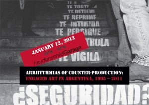 Arrhythmias showcased art practices developed in Argentina since the mid-1990s that demonstrate exceptionally creative, and widely diverse, modes of engagement with present-day social and political struggles. The artists featured in the exhibition combine artistic practices and the pursuit of creative experimentation with methodologies and epistemologies, such as those associated with militant research, radical pedagogy, direct action, community organizing, critical cartography, tactical media and Brechtian theater. Many of the projects in the exhibition were developed through direct contact with, or in explicit alignment with, left social movements. In some cases, the artistic practice was coextensive with popular forms of struggle or grass-roots organizing. Other projects include anti-imperialist historiographical interventions that interweave the Southern Cone's colonial history with its present-day neoliberal order, studies of vast informal economies and the migrant and local labor that sustains them, and provocative street performances and media interventions that reveal the logic behind the discursive and legal system of anti-terrorism.